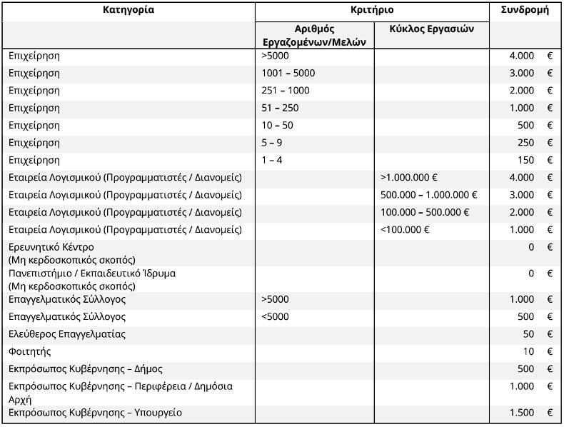 Η συνδρομή χρεώνεται σε ετήσια βάση και το ύψος της καθορίζεται κατά την εγγραφή του νέου μέλους σύμφωνα με τον πίνακα συνδρομών (Πίνακας 1).Σε περίπτωση που η εγγραφή δεν γίνει κατά τον πρώτο μήνα του έτους, το μέλος θα πληρώσει το ποσό που αντιστοιχεί στους υπολειπόμενους μήνες έως τη λήξη του τρέχοντος λογιστικού έτους. Η ανανέωση της συνδρομής γίνεται αυτόματα με την έναρξη του επόμενου λογιστικού έτους (1η Ιανουαρίου), εκτός αν υπάρχει γραπτή δήλωση διακοπής, η οποία πρέπει να υποβληθεί προς τη Γενική Συνέλευση των Εταίρων, τουλάχιστον τρεις (3) μήνες πριν τη λήξη του τρέχοντος λογιστικού έτους. Η αναπροσαρμογή των συνδρομών για το επόμενο έτος είναι δυνατή, με έγκαιρη ενημέρωση των μελών τουλάχιστον τέσσερις (4) μήνες πριν τη λήξη του τρέχοντος λογιστικού έτους.4. Δικαίωμα Ακύρωσης και Επιστροφής Χρημάτων